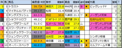 ここで最終予想を出していきます。少頭数ですがやや馬券妙味があるような気がするのですがどうなのでしょうか。天気も心配ですが、基本的に「偏差値」には馬場状態や枠の有利不利といったものは含まれていません。そのあたりはプラスαで各自の判断でお願いし…