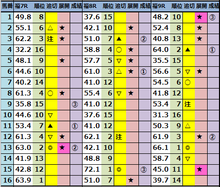 | 馬番 | 福7R | 順位 | 追切 | 展開 | 成績 | 福8R | 順位 | 追切 | 展開 | 成績 | 福9R | 順位 | 追切 | 展開 | 成績 |