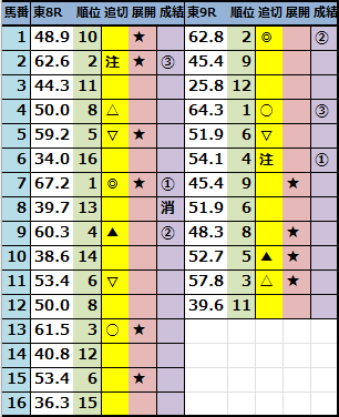 | 馬番 | 東8R | 順位 | 追切 | 展開 | 成績 | 東9R | 順位 | 追切 | 展開 | 成績 |