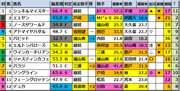 | 1 | 1 | シュネルマイスター | 66.4 | S | 継続 | ルメール | 57.3 | 手塚 | 37.8 | ▲ | ★ | 17 | 11 | |